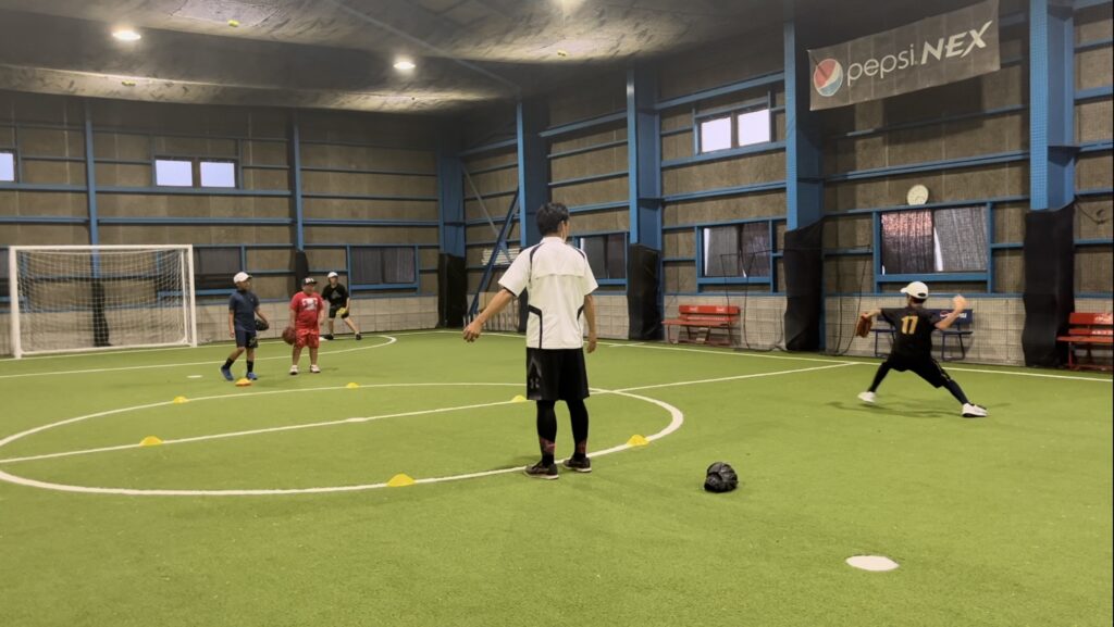 キャッチボール、フォーム確認、基礎トレーニングなど、